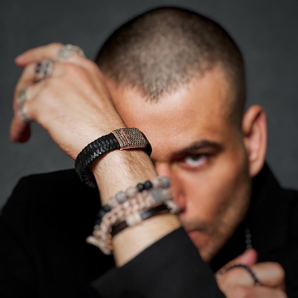 Black Diamond Wide Braided Leather Bracelet In Rose Gold