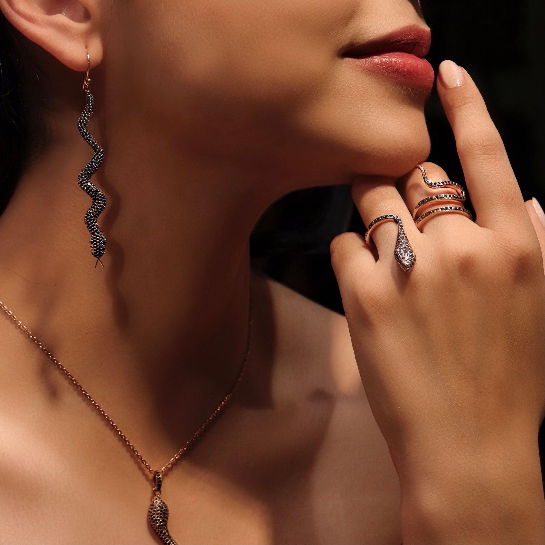 Black Diamond Double Finger Snake Ring In Rose Gold